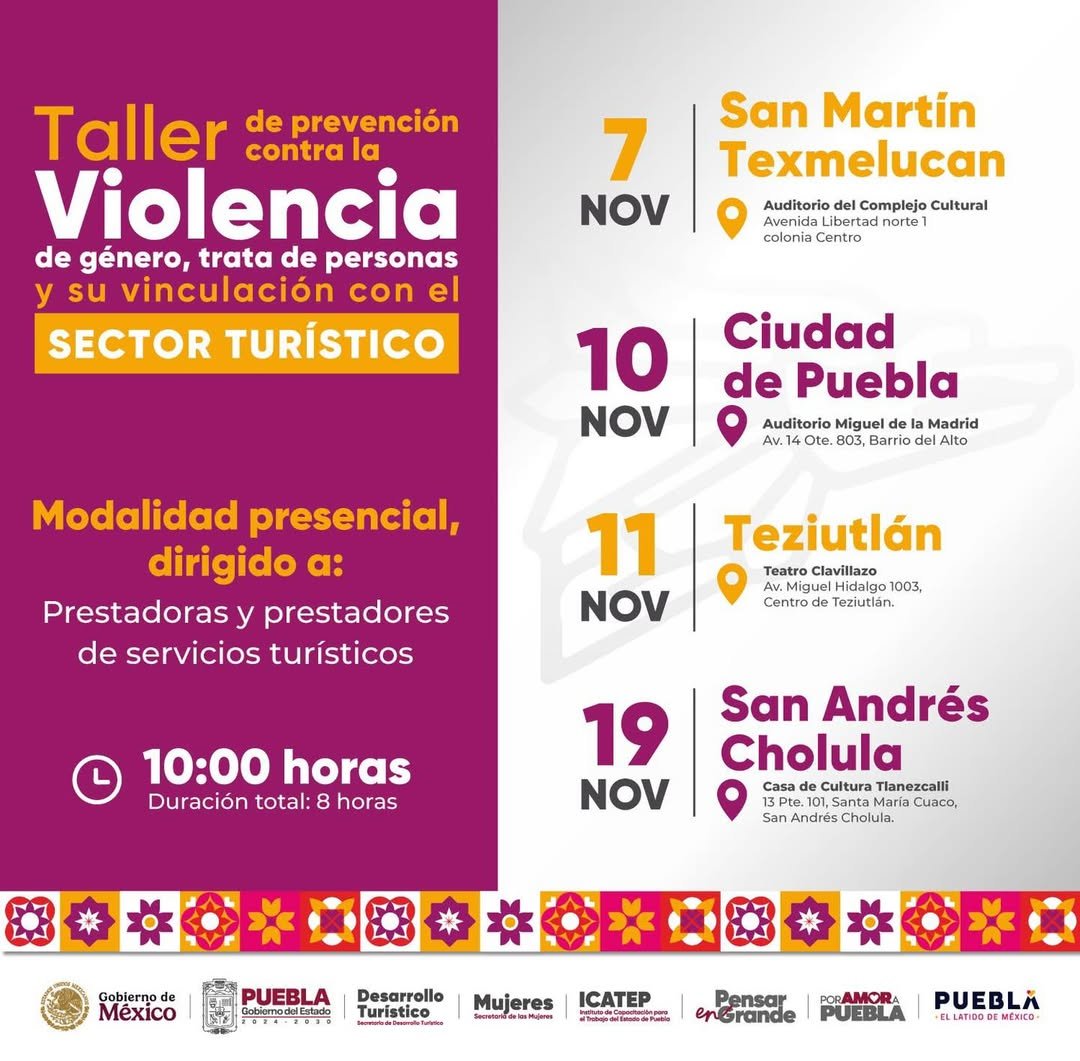 El Gobierno de Puebla impulsa el Taller de Violencia de género, trata de personas y su vinculación con el sector turístico, una jornada formativa dirigida a prestadoras y prestadores de servicios turísticos.