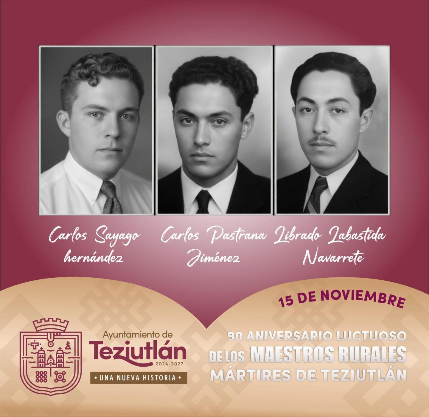 15 de noviembre, conmemoramos el 90 Aniversario Luctuoso de los Maestros Rurales Mártires de Teziutlán: Carlos Sayago Hernández, Carlos Pastrana Jimenez y Librado Labastida Navarrete.