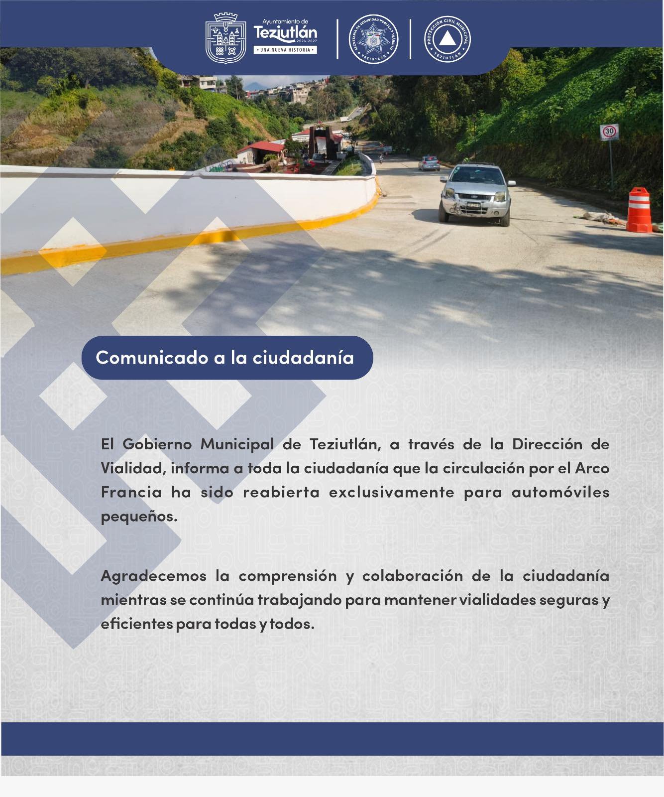 El Gobierno Municipal de Teziutlán informa que la vialidad del Arco Francia ya se encuentra abierta a la circulación, permitiendo un mejor desahogo del tráfico y contribuyendo a una movilidad más rápida y segura para todas y todos.