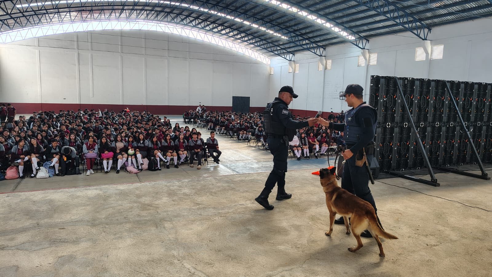 El equipo K9 realizó una demostración operativa que permitió a las y los estudiantes conocer el valioso trabajo de los binomios caninos en la detección de estupefacientes.