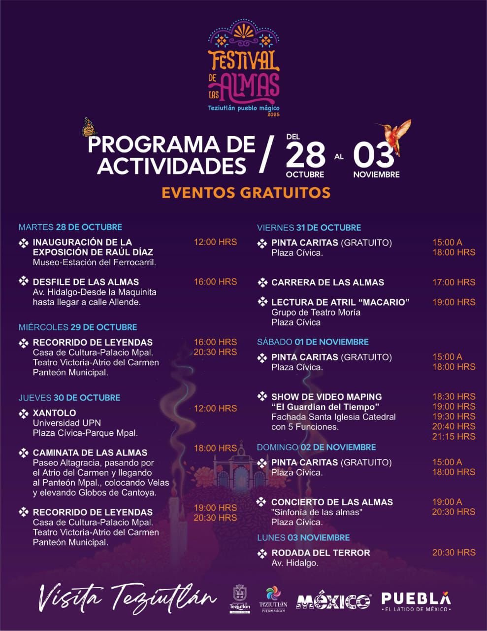 El municipio de Teziutlán, Pueblo Mágico, se vestirá de tradición, color y misticismo con la realización del “Festival de las Almas 2025”, que se llevará a cabo del 28 de octubre al 3 de noviembre, ofreciendo una amplia programación cultural gratuita en distintos puntos de la ciudad.